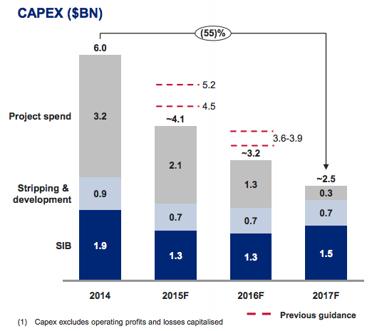 同一天里,世界第二大矿业公司力拓(Rio Tinto)也将2016年资本开支预估从此前的不到60亿美元下调至50亿美元,以平衡投资者回报与投资项目。