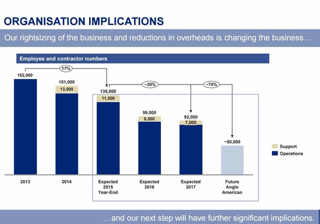 随着金属价格跌至至少六年来最低,英美资源集团首席执行官Mark Cutifani正在努力扭转公司的业绩——裁员和出售资产以保存现金。他在声明中还写道,“我们将把六大业务部重组为三个——德比尔斯(De Beers,钻矿公司)、工业金属和大宗商品,从而进一步降低我们业务的成本。”