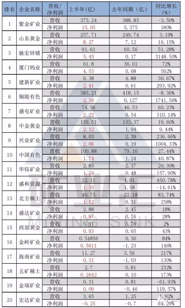 2017年上半年矿业上市公司业绩喜人,矿业汇根据上市公司发布的年报统计,截至8月31日,已有20家公司披露中报业绩,有19家公司2017年上半年归母净利润均实现同比增长。