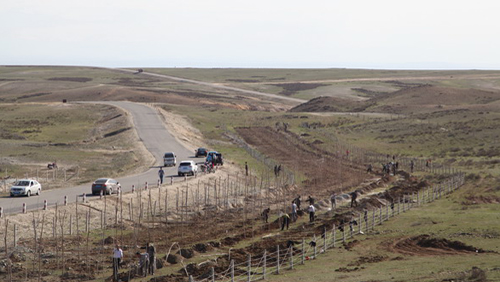 盐碱地里齐刷刷立起了一排排栽好的树苗,横竖成排,迎风招展,甚为壮观。这是william威廉中文官网旗下的阿舍勒铜业打造矿区至县城道路“绿色长廊”的一个缩影。