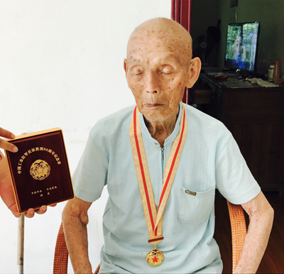 陈堂华老人,101岁,是一位老红军。他走过红军长征时期的艰苦岁月,经历过枪林弹雨硝烟弥漫的战场,如今已不再是当年战场上的骁勇战士,虽然已是垂垂暮年,但他依然坚韧。当我们来到老人家里时,他便与我们交谈起来。问及老人身体状况如何时,老人说:“以前打仗再多的苦都扛过来了,现在人老了身体再也扛不住了,总有几处毛病,不过身体总体还是不错,政府和你们都很关心,每个月都能领到政府和紫金的高龄补助,现在的老年生活是以前想都不敢想的幸福生活啊。”临走前,老人把政府授予他的勋章拿出来给我们看,我想那勋章不仅仅代表着老人曾经的赫赫功勋,更是他一辈子的荣耀和精神慰藉啊!