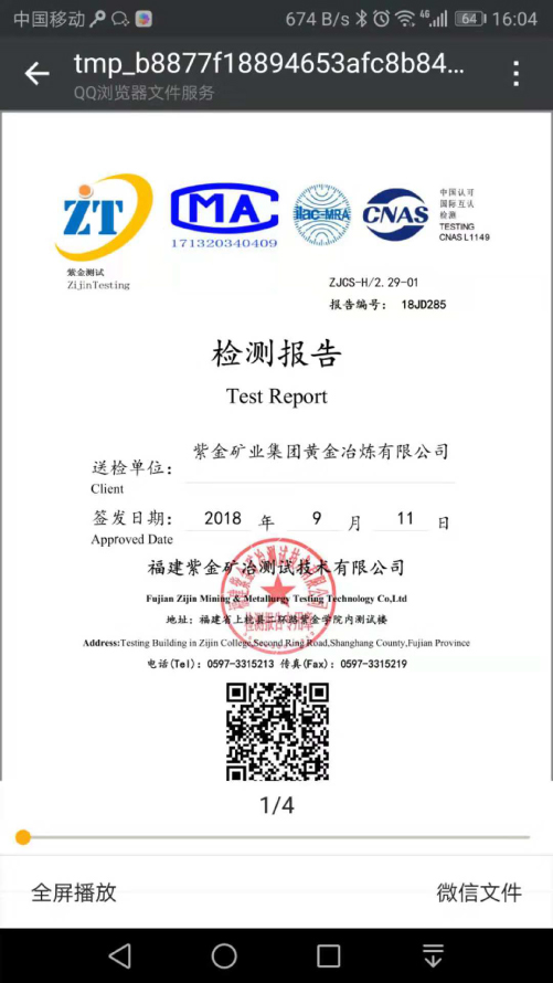 当您购买带有防伪标识的“紫金”牌标准金锭时,只需打开微信扫描金锭正面的二维码,即可获得该金锭的规格、生产批次、产品质保书、检测报告等信息;您也可以通过该平台与我们互动交流。