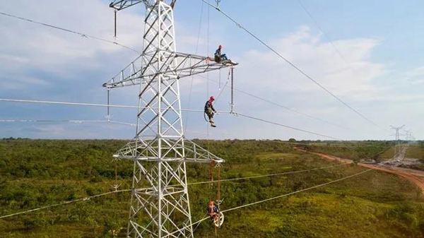 现场人员正在安装220千伏的电力线,刚果国家电网将经这条电力线向卡莫阿-卡库拉项目输送清洁、可再生的水电能源。