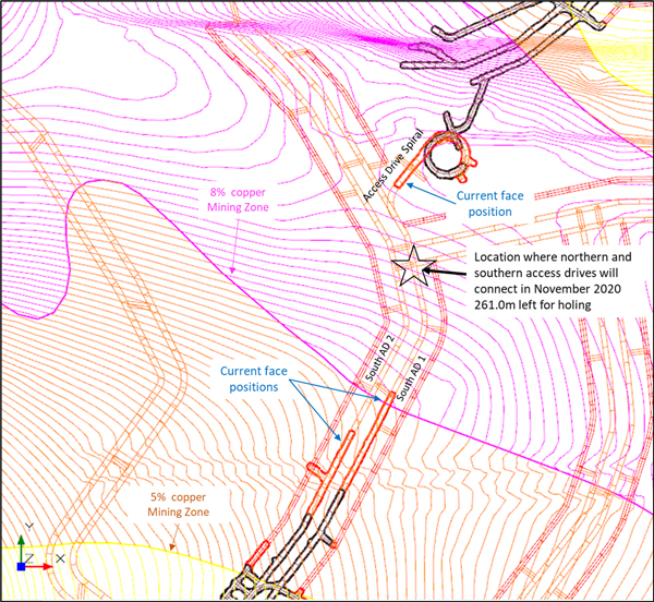 截至10月18日已完成的地下开拓工程 (黑色),以及计划在11月30日前进行的开拓工程 (绿色、棕色和紫色)。图片还显示了铜品位+3%、+5% 和+8%的等高线,以及南北运输通道计划于11月完成连接的位置 (红圈)。