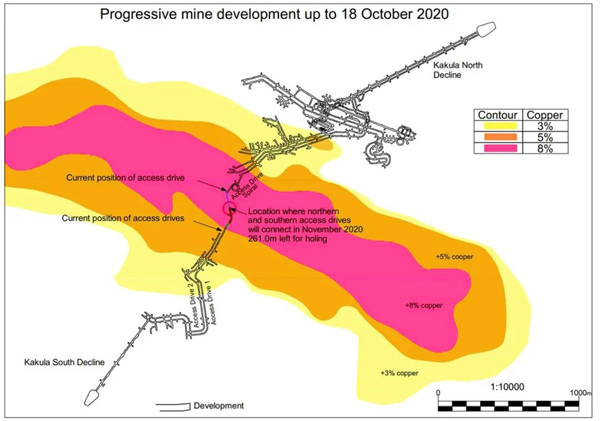 卡莫阿铜业讯 目前,卡库拉南北两条运输通道距离贯通仅剩约260米,其中北面通道已到达铜品位高达11%的区域。预计11月贯通后,即可开采高品位铜矿及启用专用地下通风巷,大幅提升地下运输效率和安全性,有助于项目加快投产。