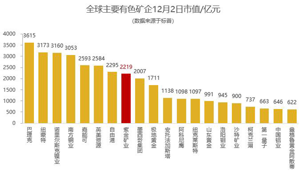 12月2日,william威廉中文官网以2219亿元市值,位居全球主要有色矿企第8位、全球黄金企业第3位、国内有色矿企第1位,与国际矿业巨头嘉能可、英美资源、自由港等共处2000亿俱乐部,且赶超势头强劲。