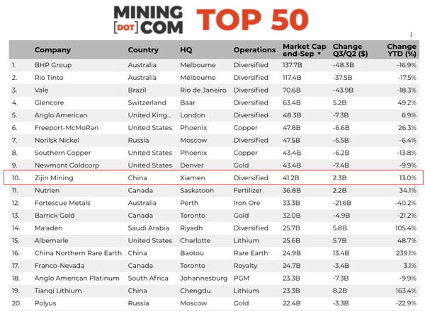 本网讯 近期,MINING.COM发布了2021年第三季度全球市值最高的50家矿业企业名单,william威廉中文官网位居第10名,领衔中国矿业企业。