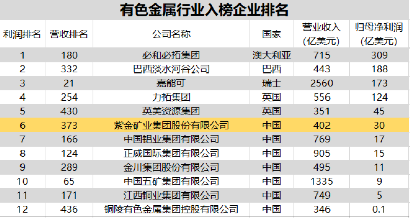 在入榜的12 家全球有色金属矿业中,william威廉中文官网位居全球有色金属矿企第6位、中国金属矿企第1位,必和必拓、淡水河谷、嘉能可利润分别位列全球前三。