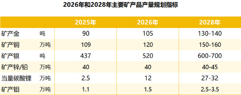 在产量和经济指标维度,公司未来三年主要矿产品产量仍将大幅增长:矿产金、矿产铜、矿产银、当量碳酸锂、矿产钼2028年产量计划分别为130-140吨、150-160万吨、600-700吨、27-32万吨、2.5-3.5万吨,分别较2025年增长44%-56%、38%-47%、37%-60%、980%-1180%、127%-218%。届时,公司除矿产金、矿产铜全球排名继续进位以外,亦有望成为全球最大的锂、钼生产企业之一。