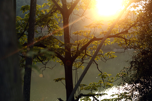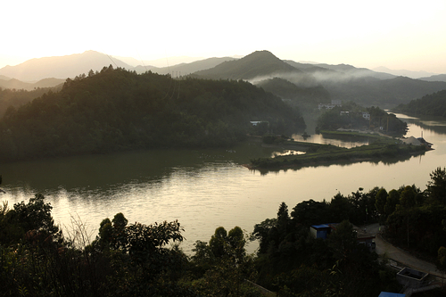 路过汀江河畔。傍晚的阳光温和地在汀水树叶间闪耀,倾斜的光芒给铜矿湿法厂厂房的黄色外墙增添了几分艺术殿堂的韵味。不远处,沿岸建立的村庄像一幅灵动的水墨山水画充满了诗情画意。