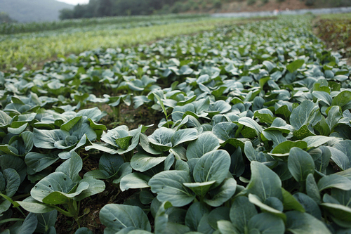 去年全部用于种植花生的外包菜地今年则改种了一大片的西瓜,还有几垄玉米、白菜、空心菜和南瓜等等。西瓜还没长出,所以看不出苗头。白菜可以收割、一些已经被摘起食用……田地间竖着若干太阳能灭虫器,像稻草人一样守在庄园里。