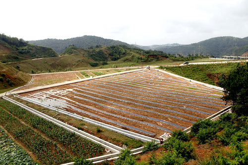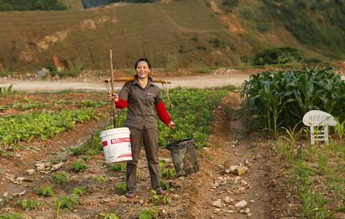 环境保护处的李涛刚接手一名已换岗员工的菜地,正在小心翼翼地尝试为菜地施肥。丘柏涛在一旁指导道,开始长苗的时候不要加太多肥料,如果苗大一些、开花后,肥料多一些没关系。矿部清洁工人曾招连正挑着水桶为菜畦浇水。对比整齐划一、品种较单一的外包的农田作物,员工们自己耕耘的菜地则五花八门,有蚕豆、小白菜、玉米、茄子、花生、血菜等等,它们有些挤在一块,纠结在一起生长,不过经过一个春天的培养,现在也长成了绿油油的一片,吸引前来散步的员工们驻足观看和调侃。