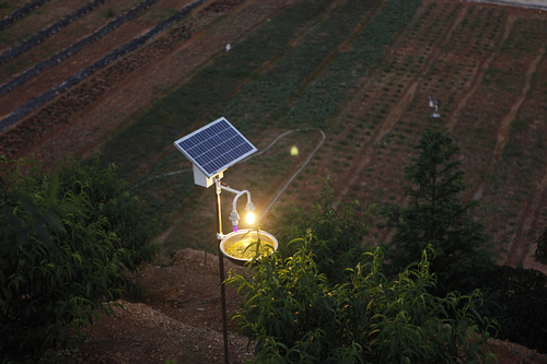 暮色降临第一盏太阳能灭虫器在果园中亮起