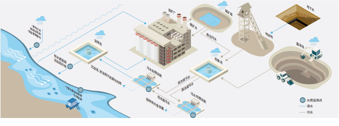 对于酸性岩石排水,我们与外部专家合作,依据《全球酸性岩石废水指南》,针对可能出现酸性岩石排水的矿区,评估并制定减少酸性岩石排水生成的方法。我们将酸性岩石排水纳入我们整体水循环体系,对较高浓度的酸性岩石排水进行有价金属回收,再与低浓度酸性岩石排水进行中和处理,达标后回用或外排。